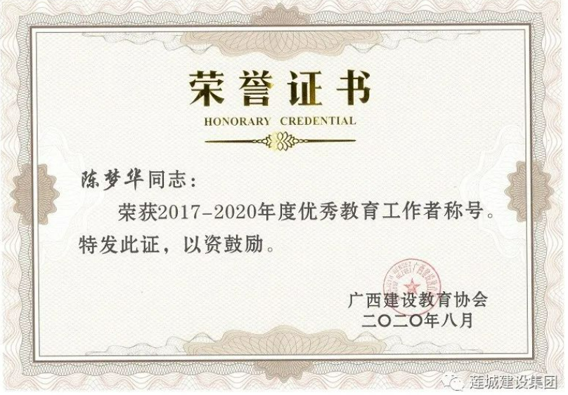 陳夢華總經(jīng)理獲頒2017-2020年度優(yōu)秀教育工作者