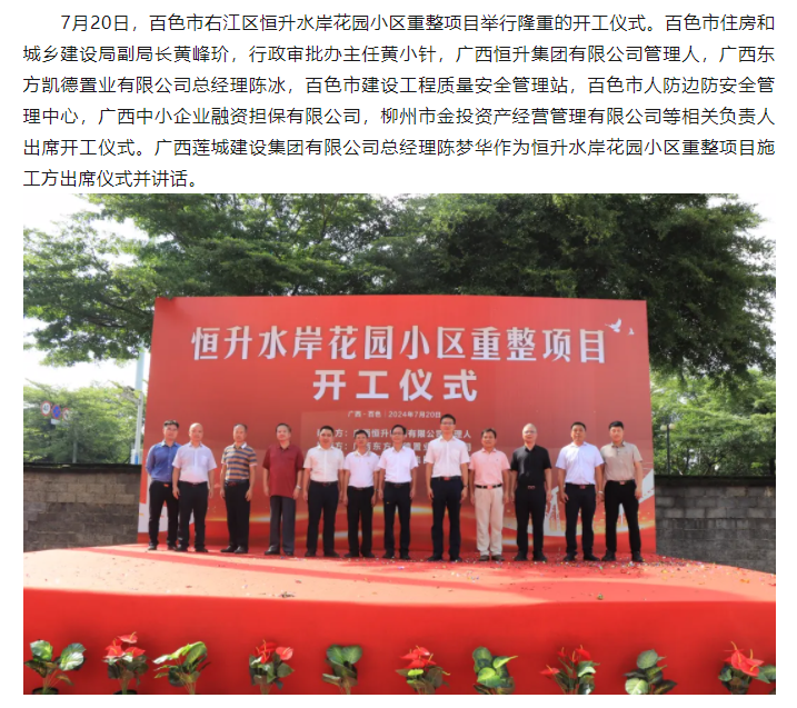 7月20日,百色市右江區(qū)恒升水岸花園小區(qū)重整項(xiàng)目舉行隆重的開(kāi)工儀式。...