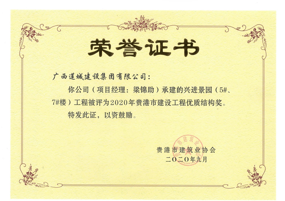 2020年貴港市建設(shè)工程優(yōu)質(zhì)結(jié)構(gòu)獎興進景園(5#、7#)工程,項目經(jīng)理:梁錦助