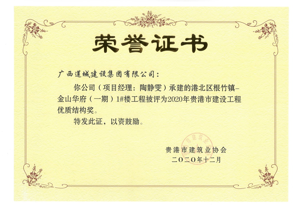 2020年貴港市建設(shè)工程優(yōu)質(zhì)結(jié)構(gòu)獎港北區(qū)根竹鎮(zhèn)-金山華府(一期)2#、3#、5#、6#樓工程,陶靜雯