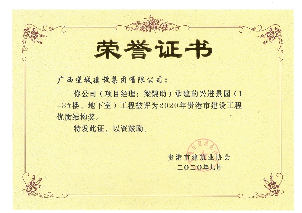2020年貴港市建設(shè)工程優(yōu)質(zhì)結(jié)構(gòu)獎興進景園(1-3#樓、地下室)工程,項目經(jīng)理:梁錦助