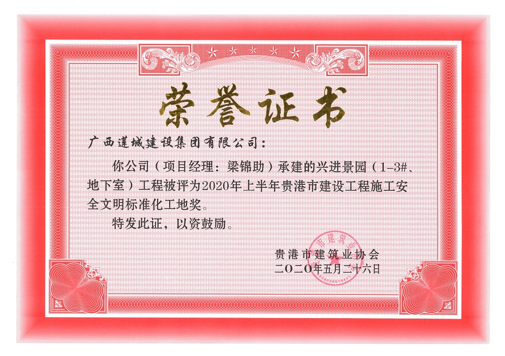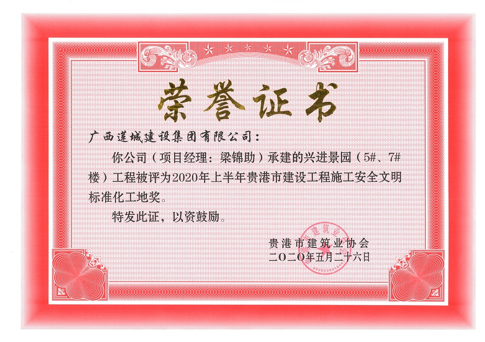 2020年上半年貴港市安全文明工地(市級)興進景園(5#、7#樓)工程,項目經(jīng)理:梁錦助