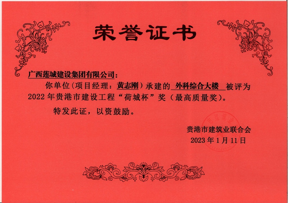 2022年貴港市建設(shè)工程“荷城杯”獎(jiǎng)(最高質(zhì)量獎(jiǎng))外科綜合大樓,項(xiàng)目經(jīng)理:黃志剛