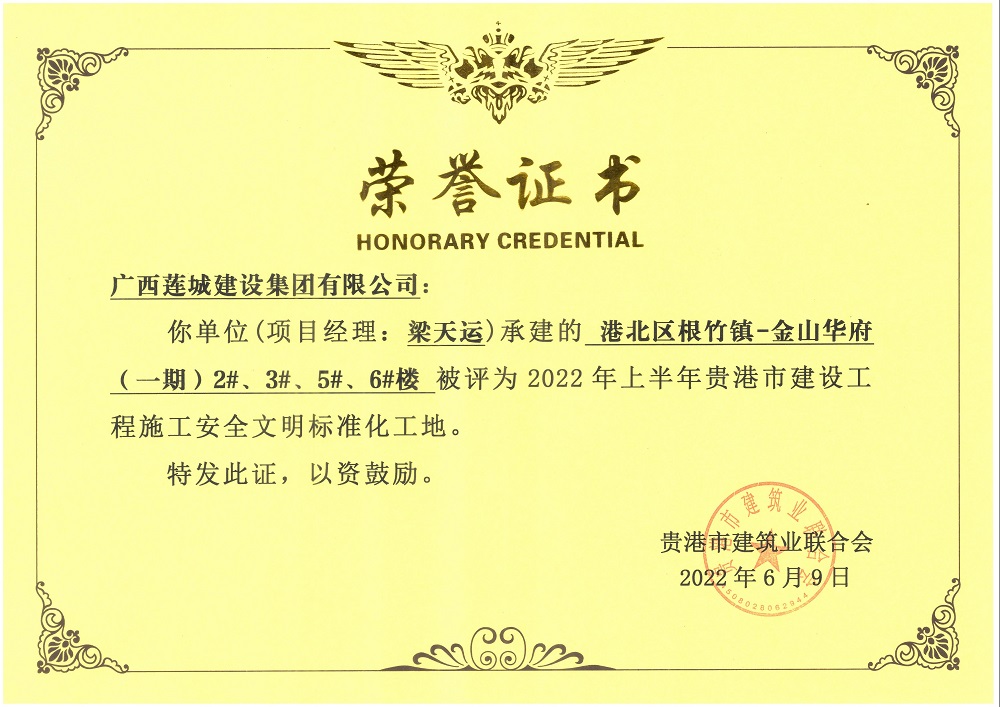 2022年上半年貴港市建設(shè)工程施工文明標(biāo)準(zhǔn)化工地港北區(qū)根竹鎮(zhèn)-金山華府(一期)2#、3#、5#、6#樓,項(xiàng)目經(jīng)理:梁天運(yùn)
