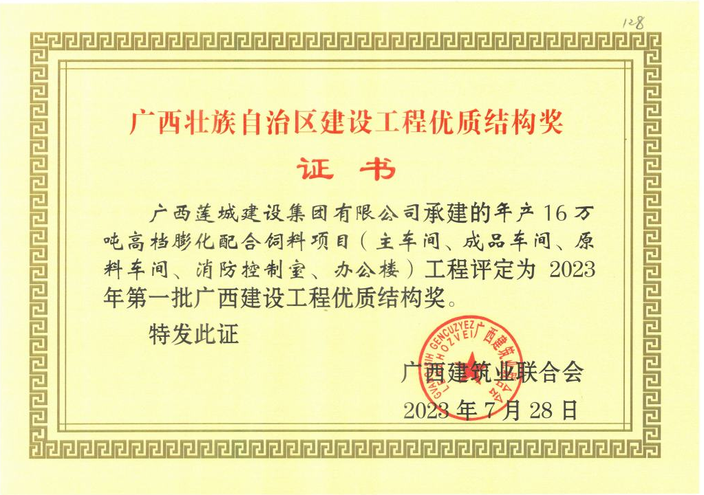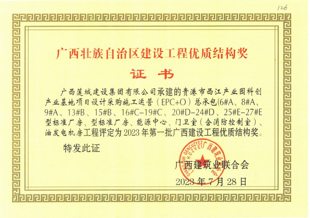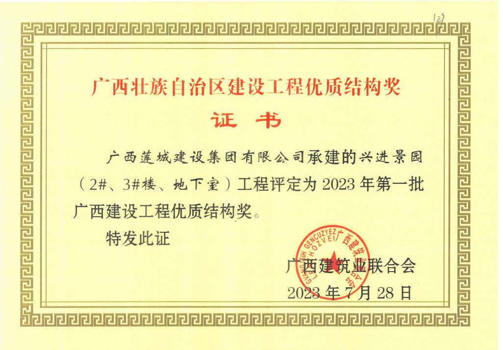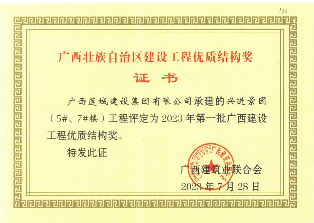 獲得2023年第一批廣西壯族自治區(qū)建設(shè)工程優(yōu)質(zhì)結(jié)構(gòu)獎(jiǎng)的項(xiàng)目分別為:貴港市港南區(qū)養(yǎng)老服務(wù)中心工程、貴港市西江產(chǎn)業(yè)園科創(chuàng)產(chǎn)業(yè)基地項(xiàng)目設(shè)計(jì)采購(gòu)施工運(yùn)營(yíng)(EPC+O)總承包(6#A、8#A、9#A、13#B、15#B、16#C-19#C、20#D-24#D、25#E-27#E型標(biāo)準(zhǔn)廠(chǎng)房、型標(biāo)準(zhǔn)廠(chǎng)房、能源中心、門(mén)衛(wèi)室(含消防控制室)油發(fā)電機(jī)房工程、桂平市人民醫(yī)院2號(hào)住院樓項(xiàng)目、年產(chǎn)16 萬(wàn)噸高檔膨化配合飼料項(xiàng)目(主車(chē)間、成品車(chē)間、原料車(chē)間、消防控制室、辦公樓)工程、興進(jìn)景園(2#、3#樓、地下室)工程、興進(jìn)景園(5#、7#樓)工程。