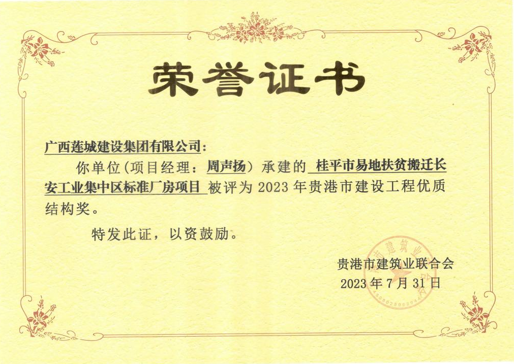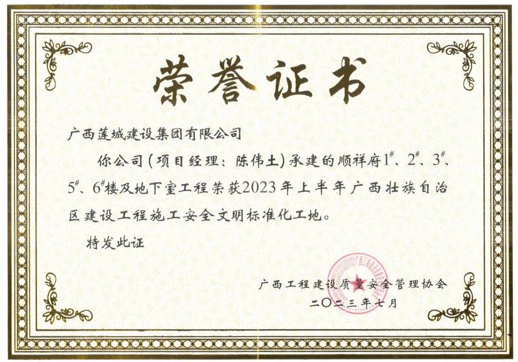 同時(shí),由集團(tuán)公司承建的順祥府1#、2#、3#、5#、6#樓及地下室工程榮獲2023年上半年廣西壯族自治區(qū)建設(shè)工程施工安全文明標(biāo)準(zhǔn)化工地獎(jiǎng);桂平市易地扶貧搬遷長(zhǎng)安工業(yè)集中區(qū)標(biāo)準(zhǔn)廠(chǎng)房項(xiàng)目榮獲2023年貴港市建設(shè)工程優(yōu)質(zhì)結(jié)構(gòu)獎(jiǎng)。