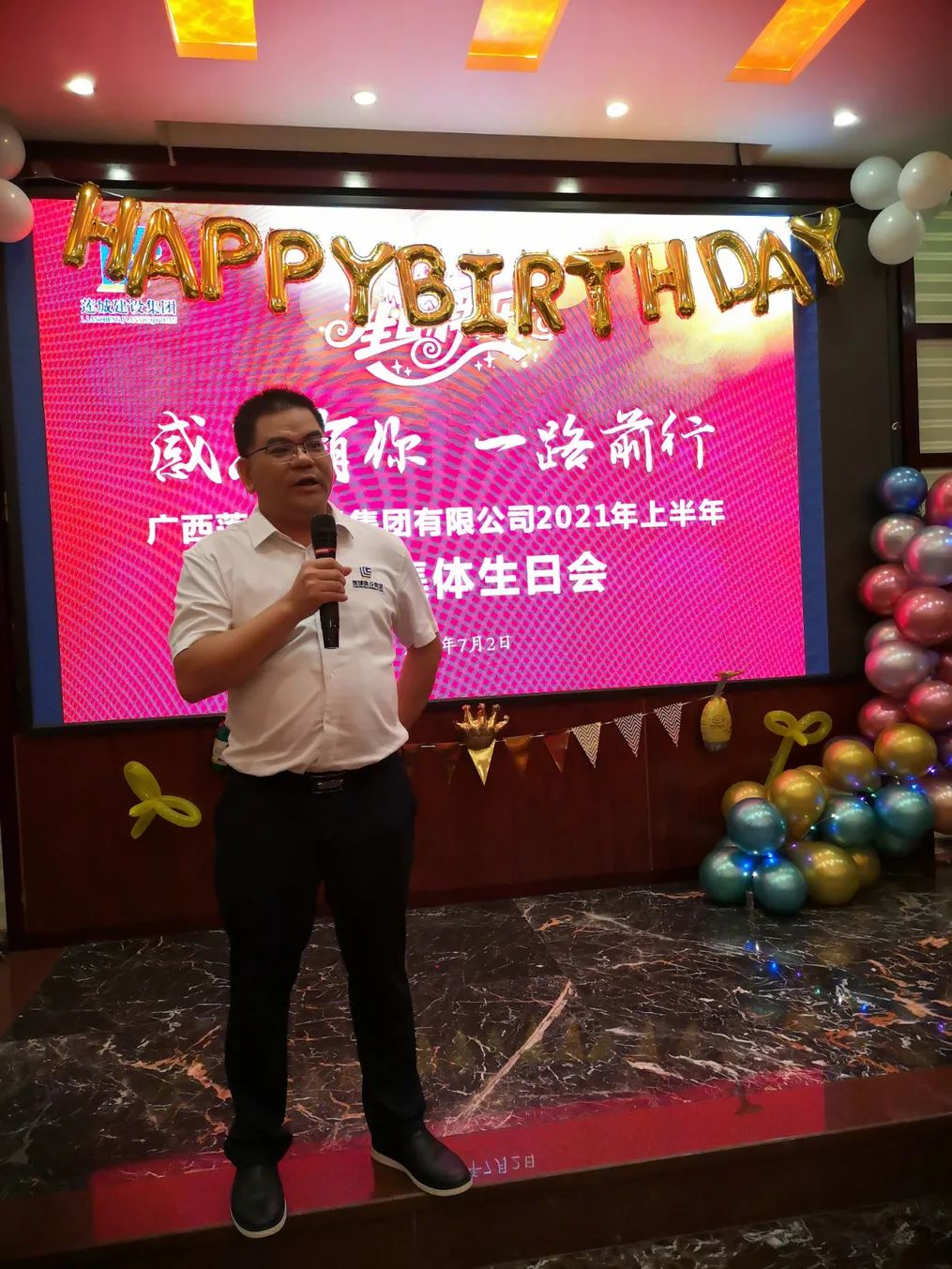 7月2日晚,廣西蓮城建設(shè)集團(tuán)有限公司在貴港市新誼賓酒店二樓舉辦以“感恩有你 一路前行”為主題的2021年上半年員工集體生日會(huì),集團(tuán)公司貴港辦公區(qū)全體員工歡聚一堂為2021年上半年生日的15位壽星們共慶生日。