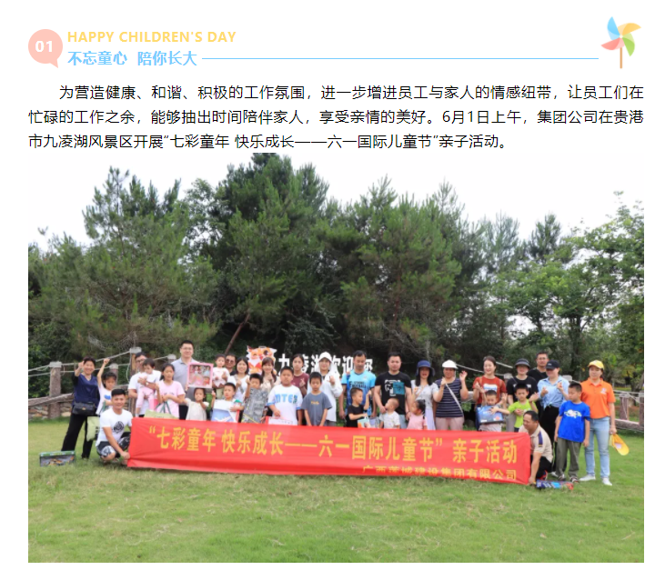 為營(yíng)造健康、和諧、積極的工作氛圍,進(jìn)一步增進(jìn)員工與家人的情感紐帶,讓員工們?cè)诿β档墓ぷ髦?,能夠抽出時(shí)間陪伴家人,享受親情的美好。6月1日上午,集團(tuán)公司在貴港市九凌湖風(fēng)景區(qū)開(kāi)展”七彩童年 快樂(lè)成長(zhǎng)--六一國(guó)際兒童節(jié)“親子活動(dòng)。...