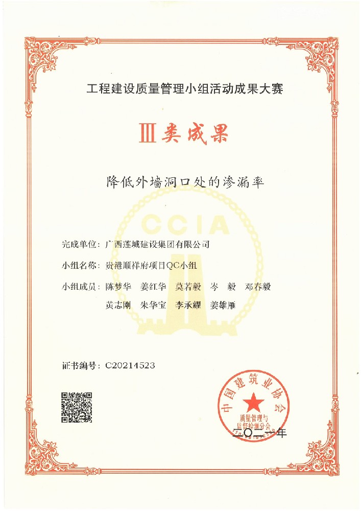降低外墻洞口處的滲漏率,貴港順祥府項目QC小組,成員:陳夢華、姜紅華,莫若毅,岑毅,鄧春毅,黃志剛,朱華寶,李承耀,姜雄雁提高地下室曲面剪力墻施工質(zhì)量一次驗收合格率,蓮城大廈項目QC小組,成員:陳夢華、朱華寶,姜紅華,莫若毅,岑毅,鄧春毅,黃志剛,李承耀,姜雄雁,黃文靜提高樓梯混凝土施工質(zhì)量,興進景園項...