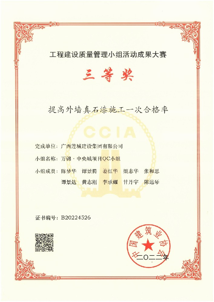 提高外墻真石漆施工一次合格率,三等獎,成員:陳夢華、譚景騰、姜紅華、梁志華、張和思、譚景達、黃志剛、李承耀、甘丹宇、陳遠琴提高屋面防水卷材施工質(zhì)量一次合格率,二等獎,小組成員:陳夢華、譚燕喜、姜紅華、陳霖、姜雄雁、黃文亮、黃志剛、岑毅、黃娟、韋建協(xié)提高現(xiàn)澆樓梯混凝土結(jié)構(gòu)施工質(zhì)量,三等獎,成員:陳夢華、譚...